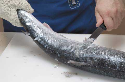 Skalieren Sie den Fisch über Eis oder unter kalt fließendem Wasser, indem Sie die Haut vom Schwanz zum Kopf schaben. Spülen und trocknen Sie den Fisch, um die Metzgerei zu beginnen.